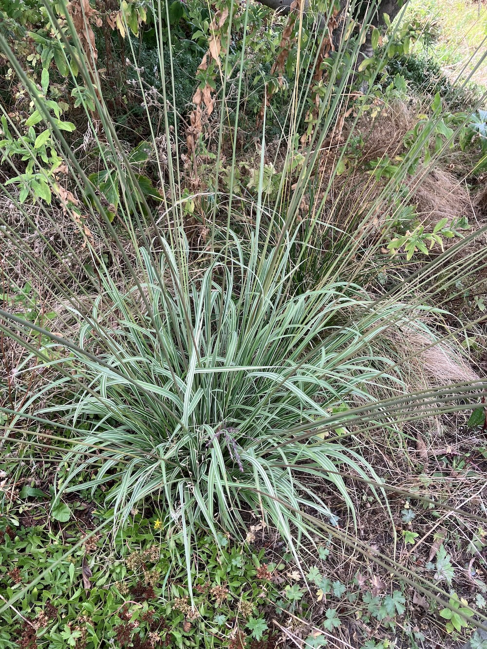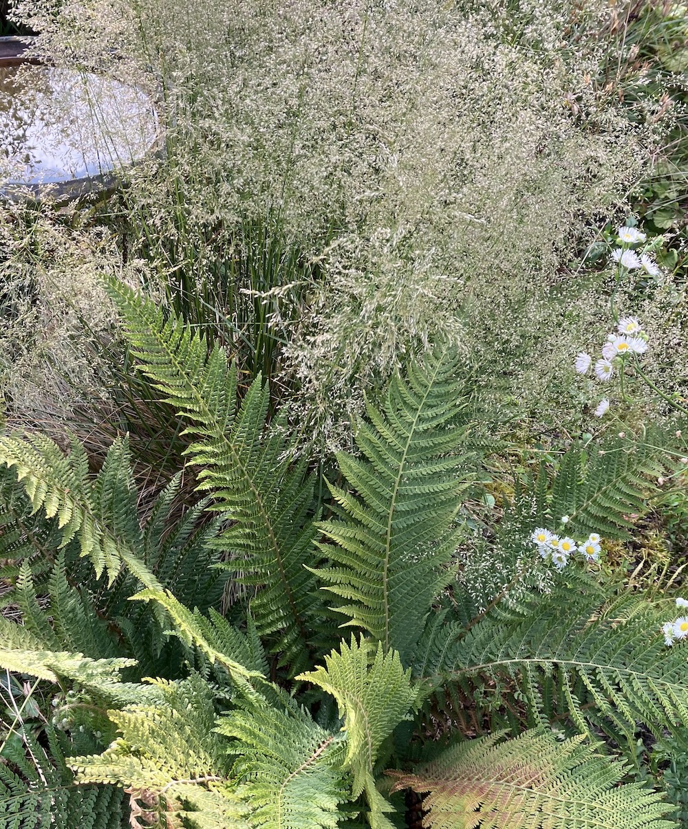 Mijn favoriete inheemse gras. (op de foto Γ‘chter de varen) Begint het seizoen als stevige groene graspol waarna er ragfijne aren verschijnen die een prachtige wolk tussen de beplanting vormen. In de loop van de zomer kleuren de aren langzaam naar een prachtig oranje-bruin